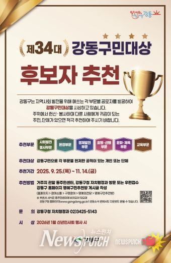 뉴스펀치 김완규 기자 | 강동구가 오는 11월 14일(금)까지 지역을 빛낸 ‘제34대 강동구민대상’ 후보자를 공개 모집한다고 15일 밝혔다.