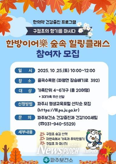 뉴스펀치 김길룡 기자 | 파주보건소는 시민들의 건강한 삶을 위한 한의약 건강 증진 프로그램인 ‘한방이어락(樂) 숲속 치유교실(힐링 클래스)’을 오는 25일 10시부터 12시까지 율곡수목원에서 운영한다.