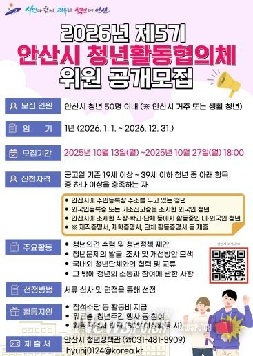 뉴스펀치 김길룡 기자 | 안산시는 오는 27일까지 ‘제5기 안산시 청년활동협의체’ 위원 50명을 공개 모집한다고 15일 밝혔다.