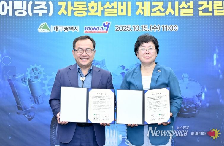 뉴스펀치 조평훈 기자 | 대구광역시는 10월 15일 대구시청 산격청사에서 영일엔지니어링㈜(대표 이창은)과 금호워터폴리스 내 ‘전기차 부품 자동화설비 제조시설’ 건립을 위한 투자협약을 체결했다.