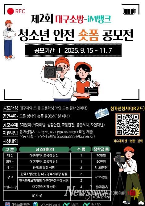 뉴스펀치 조평훈 기자 | 대구소방본부와 대구광역시교육청이 주최하고 iM뱅크, iM유페이가 후원하는 ‘제2회 대구소방-iM뱅크 청소년 안전 숏폼 공모전’이 오는 11월 7일까지 열린다.
