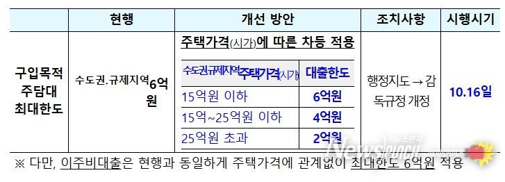 수도권·규제지역에 적용되는 주택구입목적 주담대의 대출한도(現 6억원)를 주택가격(시가) 수준에 따라 차등 적용한다. 수도권 · 규제지역의 ➊시가 15억원 이하 주택의 주담대 한도는 현행과 동일한 6억원, ➋시가 15억원 초과~25억원 이하 주택은 4억원, ➌시가 25억원 초과 주택은 2억원으로 대출한도를 차등 적용한다. 이를 통해 수도권·규제지역 내에서 대출을 활용한 고가주택 구입 수요를 보다 강력하게 관리해 나갈 예정이다.
