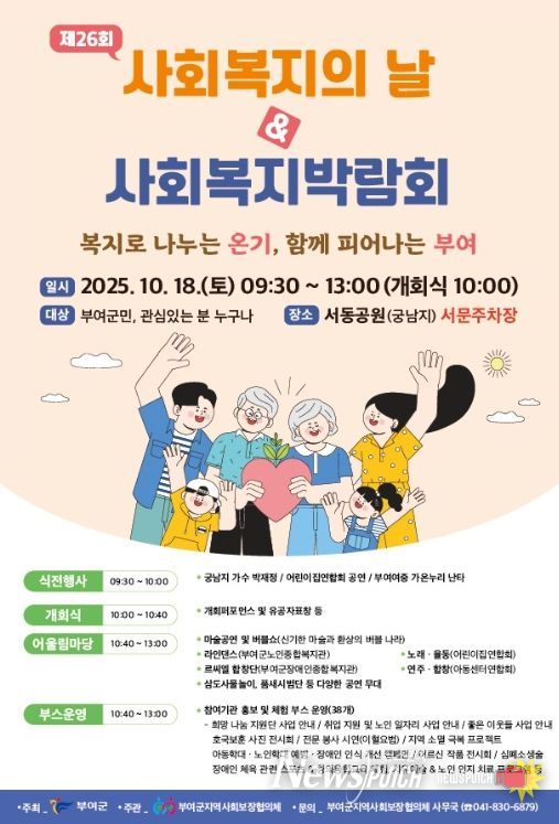 뉴스펀치 김길룡 기자 | 부여군은 오는 10월 18일 서동공원 서문주차장에서 ‘제26회 사회복지의 날 및 사회복지박람회’를 개최한다고 밝혔다.