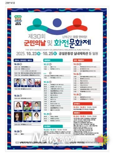 뉴스펀치 김길룡 기자 | 남해군민의날추진위원회는 오는 10월 23일부터 25일까지 3일간 남해공설운동장과 실내체육관 일원에서 ‘제30회 군민의 날 및 화전문화제’를 개최한다.