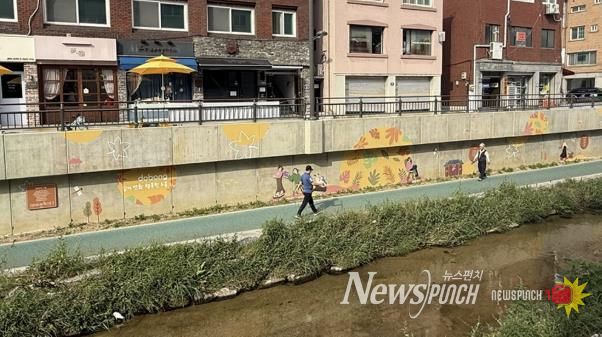뉴스펀치 김완규 기자 | 방학천(금강아미움 맞은편~방학교) 옹벽 약 360m 구간이 걷고 싶고 머무르고 싶은 산책길로 탈바꿈했다.