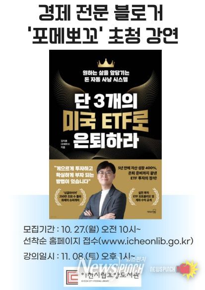 뉴스펀치 김길룡 기자 | 이천시 효양도서관은 시민들의 경제적 이해력 향상과 현명한 자산 관리 능력 제고를 위해 오는 11월 8일 오후 1시, '단 3개의 미국 ETF로 은퇴하라'의 저자이자 네이버 경제 전문 블로거 김지훈(필명 포메뽀꼬)을 초청해 재테크 특강을 진행한다.
