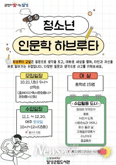 참여 대상은 중학생이며, 신청은 10월 21일 오전 9시부터 달성군립도서관 홈페이지를 통해 선착순으로 진행된다.