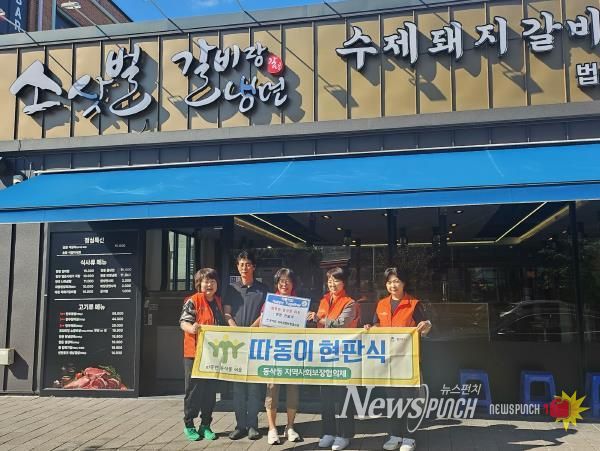 뉴스펀치 김길룡 기자 | 평택시 동삭동 지역사회보장협의체는 지난 15일 관내 취약계층 10가구에 월 2회 정기적으로 5가지 밑반찬을 지원할 예정인 소삿벌 법원직영점에 ‘따동이’ 5호점 현판을 전달했다.