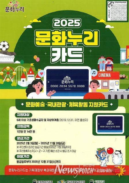 최다원 문화예술과장은 “문화누리카드는 단순한 지원금이 아닌 문화 향유 기회를 확대하는 복지제도”라며, “연말에 사용이 몰리지 않도록 미리 사용해 주시길 바란다”라고 전했다.