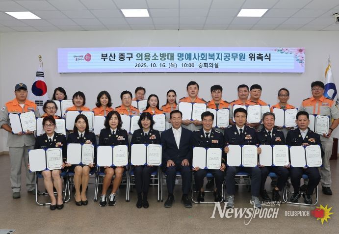뉴스펀치 김길룡 기자 | 부산 중구는 지난 16일 중부소방서 의용소방대원 54명을 중구 명예사회복지공무원으로 위촉하는 행사를 개최했고, 중부소방서 의용소방대 본대 이봉석 남성대장, 심경란 여성대장등이 참석했다.