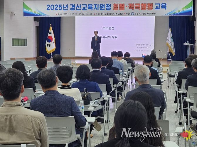 뉴스펀치 김길룡 기자 | 경산교육지원청은 10월 15일 13시 10분부터 경산교육지원청 학생교육지원관 2강당에서 청렴·적극행정 교육을 실시했다.