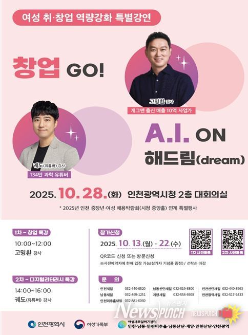 뉴스펀치 조평훈 기자 | 인천광역시가 오는 10월 28일 개최되는 ‘2025년 인천 중장년·여성 채용박람회’와 연계해 특별행사로 여성의 취·창업 역량 강화를 위한 특별강연을 시청 본관 2층 대회의실에서 개최한다고 밝혔다.