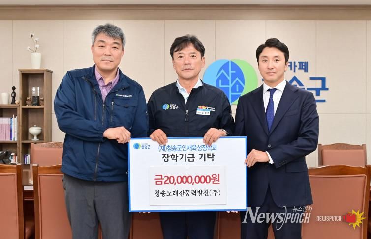 뉴스펀치 김길룡 기자 | 청송노래산풍력발전(주)은 지난 16일 지역사회와의 상생 및 미래 인재 육성을 위해 (재)청송군인재육성장학회에 장학금 2천만 원을 기탁했다.