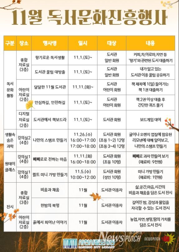 뉴스펀치 김길룡 기자 | 사천시는 사천시립도서관에서 11월 한 달 동안 책과 함께 여유로운 시간을 보내며 감성을 채울 수 있는 다양한 독서문화행사와 체험 프로그램을 운영한다고 17일 밝혔다.