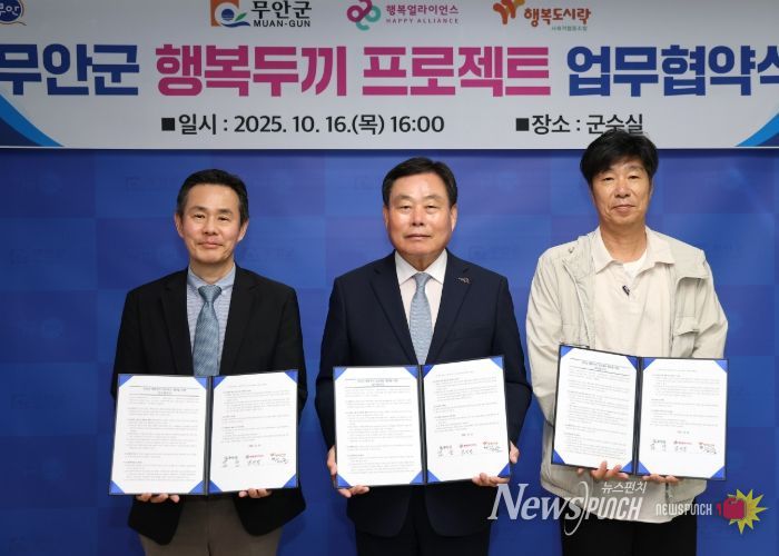뉴스펀치 김길룡 기자 | 전남 무안군은 지난 16일 무안군청 군수실에서 행복얼라이언스 및 행복도시락사회적협동조합과 함께 결식 우려 아동을 위한 '행복두끼 프로젝트' 업무협약을 체결했다.