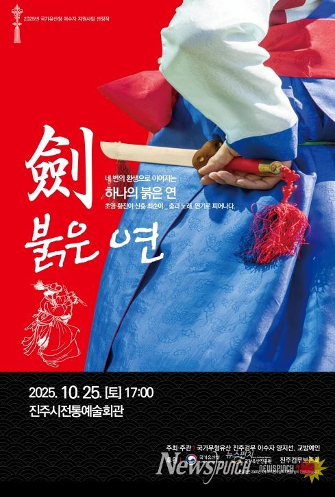 뉴스펀치 김길룡 기자 | 경상국립대학교(GNU·총장 권진회) 학술연구교수이자 국가무형유산 진주검무 이수자인 양지선 대표가 이끄는 ‘교방예인’이 10월 25일 오후 5시 진주시전통예술회관에서 창작무용극 ‘劍 붉은 연’을 선보인다. 이 작품은 2025년 국가유산청 이수자 지원사업 선정작으로, 고려부터 현대까지 시대를 초월한 네 명의 기생 이야기를 춤·노래·연기로 풀어낸 창작 춤 서사극이다.