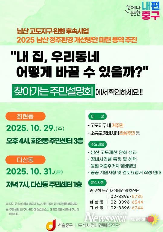 뉴스펀치 김완규 기자 | 서울 중구가 오는 10월 29일과 31일 회현동과 다산동 주민센터에서 '찾아가는 주민설명회'를 열고 남산 고도지구 완화 후속사업과 남산 정주환경 개선방안을 주민들과 공유한다.