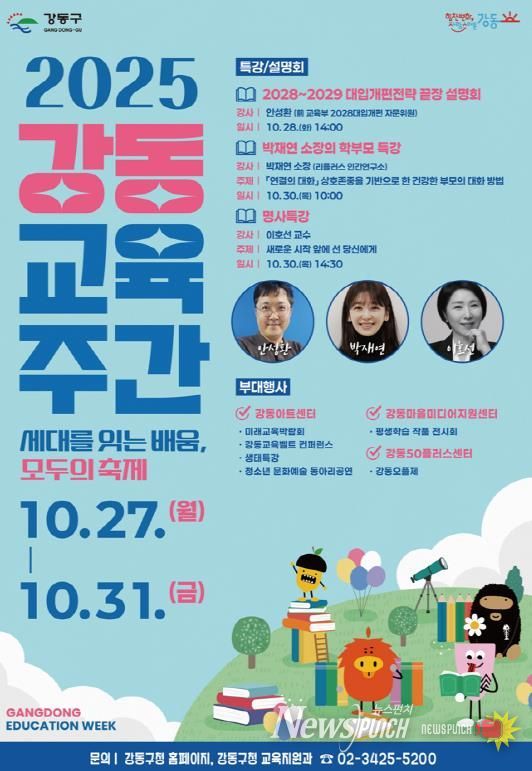 뉴스펀치 김완규 기자 | 강동구는 오는 10월 27일~10월 31일 '2025 강동교육주간'을 연다고 밝혔다. ‘세대를 잇는 배움, 모두의 축제’라는 주제로 지역 주민 누구나 참여할 수 있는 강연과 전시, 체험 프로그램이 5일간 이어질 예정이다.