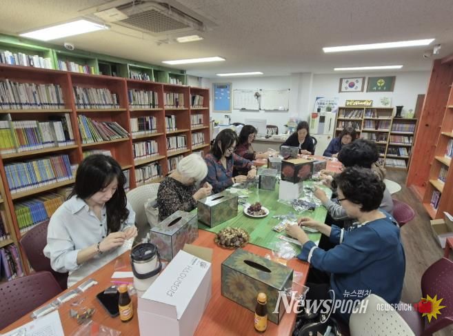 뉴스펀치 김길룡 기자 | 수원시 팔달구 우만2동 새마을문고는 지난 16일 문고 프로그램 일환으로 비즈 티슈케이스 만들기를 진행했다.