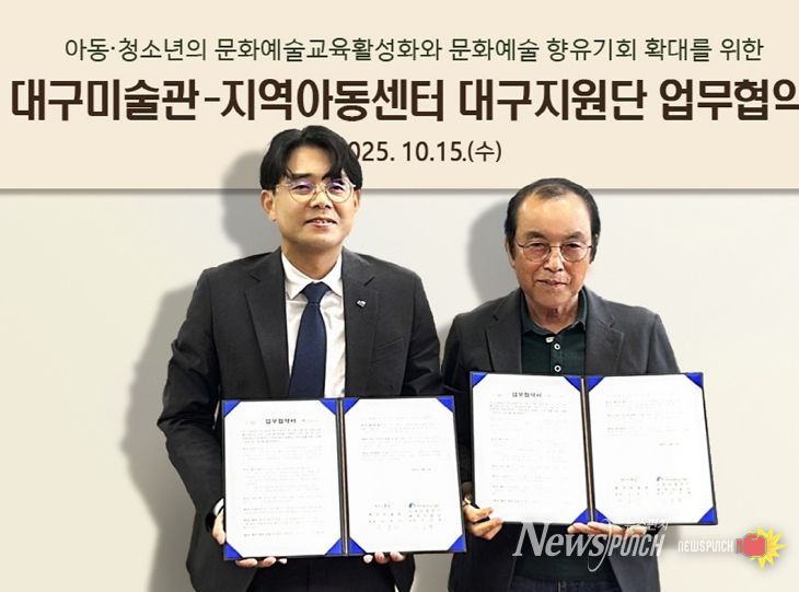 뉴스펀치 조평훈 기자 | 대구문화예술진흥원 대구미술관과 지역아동센터대구지원단(단장 이상열)은 지난 10월 15일 대구미술관에서 아동·청소년 문화예술교육 활성화와 문화예술 향유 기회 확대를 위한 업무협약을 체결했다.