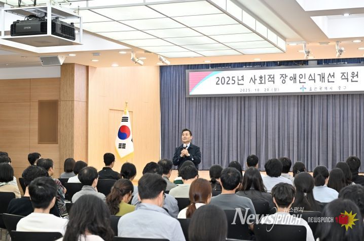 뉴스펀치 김길룡 기자 | 울산 중구가 10월 20일 오후 3시 중구청 대회의실에서 직원들을 대상으로 2025년 사회적 장애인식개선 교육을 실시했다.