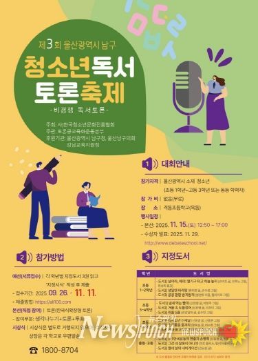 뉴스펀치 김길룡 기자 | 울산 남구는 청소년의 독서습관 형성과 건전한 토론문화 확산을 위해 오는 11월 15일 격동초등학교에서 개최하는‘2025년 제3회 울산광역시 남구 청소년 독서 토론축제’참가자를 모집한다고 밝혔다.