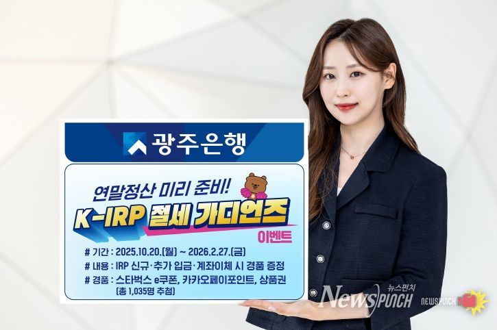 뉴스펀치 김길룡 기자 | 광주은행은 20일, 연말정산 시즌을 맞아 절세 혜택을 받을 수 있는 연금계좌 활용법에 대한 관심이 높아짐에 따라, 개인형 IRP(개인형퇴직연금) 고객을 대상으로 ‘K-IRP 절세 가디언즈’이벤트를 실시한다고 밝혔다.