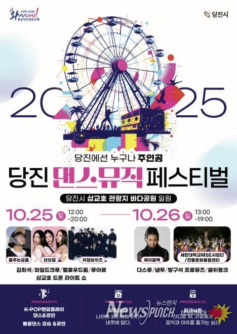 뉴스펀치 김길룡 기자 | 당진시가 오는 25일과 26일 이틀간 삽교호 관광지 바다공원 일원에서‘2025년 당진 댄스·뮤직 페스티벌(DDMF)’을 개최하며, '춤과 음악으로 하나 되는 당진, 당진에선 누구나 주인공'이라는 주제로 화려한 가을 축제의 장을 펼친다.