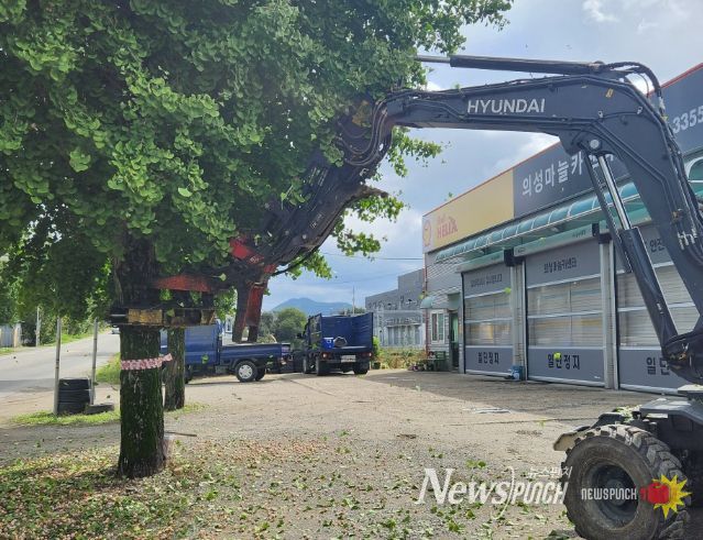 뉴스펀치 김길룡 기자 | 의성군은 지난 19일 은행나무에서 떨어지는 열매로 인한 주민 불편을 해소하기 위해 진동 수확기를 활용한 시범 채취 작업을 실시했다.