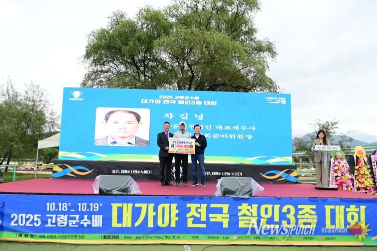 뉴스펀치 김길룡 기자 | 10월 19일 세무법인 팔공 차길녕 대표세무사가 ‘2025 고령군수배 대가야 전국 철인3종 대회’ 개막식에서 지역의 교육 발전과 인재 양성을 위해 사용해 달라며 교육발전기금 500만원을 기탁했다.