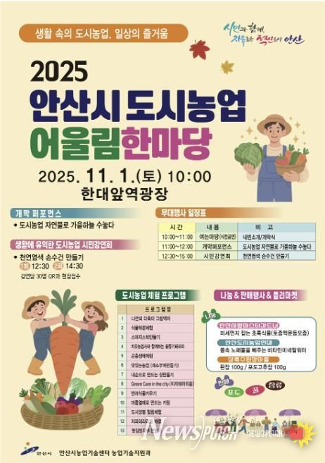 뉴스펀치 김길룡 기자 | 안산시는 11월 1일 한대앞역 광장 일원에서 ‘안산시 도시농업 어울림한마당’을 개최한다고 21일 밝혔다.