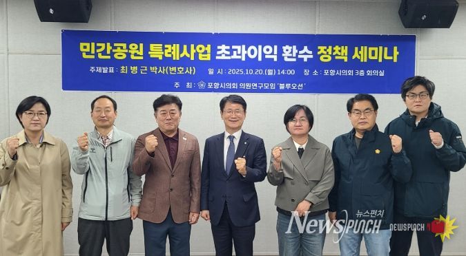 뉴스펀치 김길룡 기자 | 포항시의회 의원연구단체 블루오션(대표의원 김만호)은 지난 20일 오후 2시 시의회에서 최병근 박사(법무법인‘뿌리’대표변호사)를 초청해‘민간공원 특례사업 초과이익 환수 정책 세미나’를 개최했다.