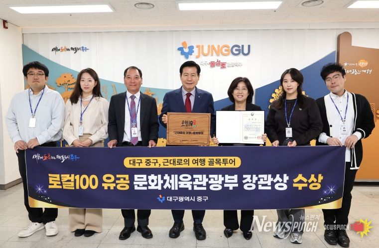 뉴스펀치 조평훈 기자 | 대구 중구는 지난 18일 제주 서귀포시 천지연폭포 일원에서 열린 ‘2025 문화의 달’ 기념행사에서 ‘근대로의 여행, 골목투어’가 문화체육관광부 ‘우수 로컬100 유공’에 선정됐다고 밝혔다.