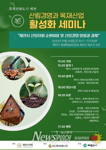 뉴스펀치 김길룡 기자 | 제천시의회은 오는 10월 24일, 제천시 평생학습관에서 ‘목재친화도시 제천의 산림경영과 목재산업 활성화 세미나’를 개최한다.