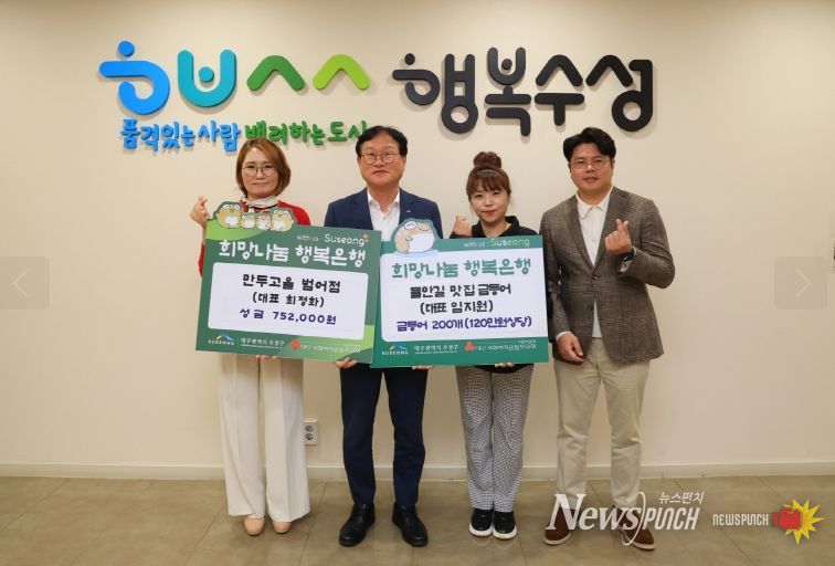 뉴스펀치 조평훈 기자 | 대구 수성구 소재 외식업소 2곳이 어려운 이웃을 위해 성금과 물품을 수성구청에 기탁했다.