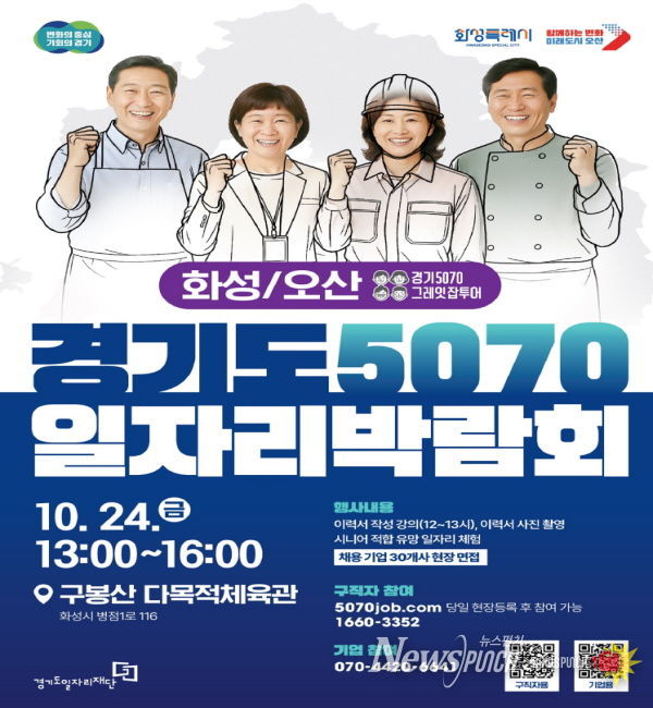 뉴스펀치 김길룡 기자 | 경기도와 경기도일자리재단은 오는 10월 24일, 구봉산 다목적체육관에서 중장년층을 위한 『2025 경기도 5070 일자리박람회 in 화성+오산』를 개최한다고 밝혔다.