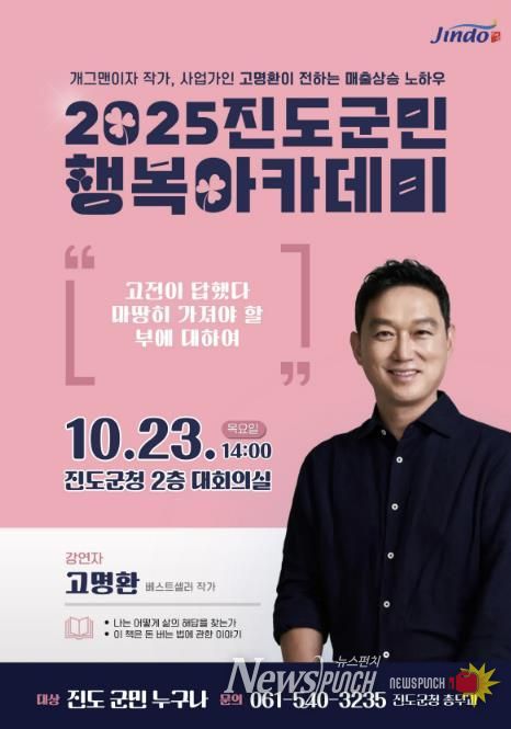 뉴스펀치 김길룡 기자 | 진도군은 오는 10월 23일 오후 2시, 진도군청 대회의실에서 개그맨 출신의 고명환 작가를 초청해 ‘진도 군민행복 아카데미’ 강연을 개최한다고 밝혔다.