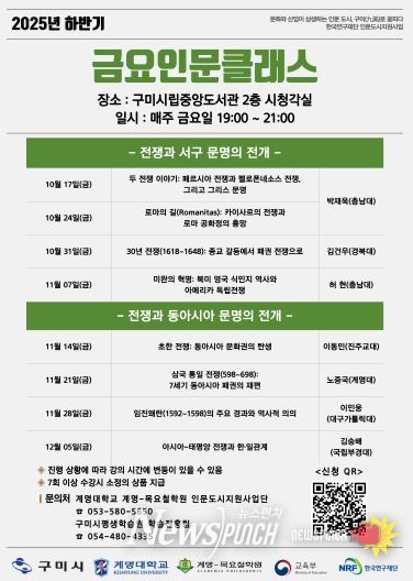 강좌의 대주제는 '전쟁사와 문명의 전개’로 전쟁이 단순한 충돌이 아닌 문명을 재편시키는 동력으로 작용해 온 역사적 의미를 동서양 전쟁사를 통해 탐구한다. 강좌는 10월 17일부터 12월 5일까지 매주 금요일 오후 7시부터 9시까지, 구미시립중앙도서관 시청각실에서 총 8회에 걸쳐 진행된다.