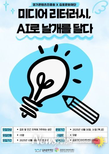 뉴스펀치 김길룡 기자 | (재)김포문화재단과 경기콘텐츠진흥원은 오는 10월 30일과 31일, 양일간 김포미디어아트센터 교육실에서 '미디어리터러시, AI로 날개를 달다' 디지털 리터러시 및 AI 활용 교육을 공동 개최한다고 밝혔다.