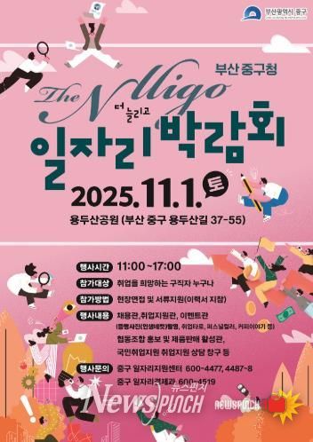 뉴스펀치 김길룡 기자 | 부산 중구는 11월1일 11:00~17:00 중구 용두산공원 광장에서 『2025 중구 The Nlligo 일자리박람회』 를 개최한다.