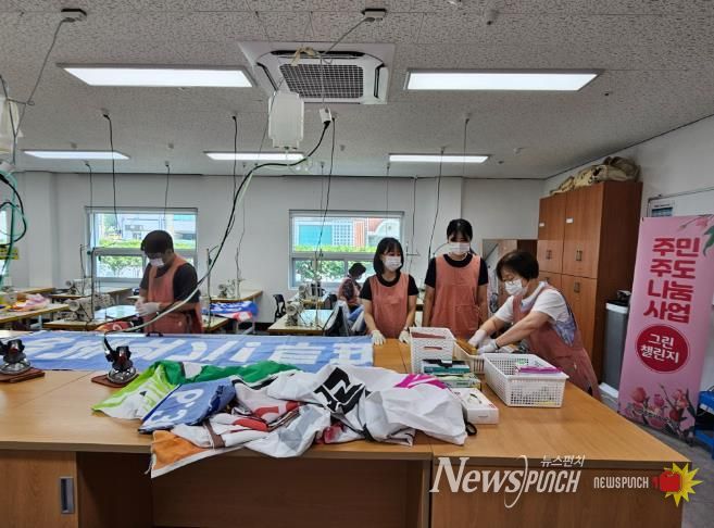 뉴스펀치 김길룡 기자 | 서부종합사회복지관은 20일 지역주민들의 재봉기술 재능기부로 지난 대선 홍보용 폐현수막을 활용하여 마대자루 158개를 제작하여 울주군시설관리공단에 전달했다고 밝혔다.