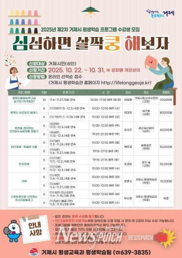 뉴스펀치 김길룡 기자 | 거제시는 오는 10월 22일부터 31일까지 ‘심쿵해(심심하면 살짝쿵 해보자)’ 평생학습 프로그램 수강생을 선착순으로 모집한다고 밝혔다.