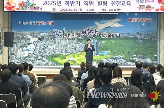 뉴스펀치 조평훈 기자 | 대구 달서구는 지난 20일 구청에서 민원담당 직원 등 220여 명을 대상으로, 개그공연과 친절교육을 결합한 새로운 형식의‘힐링 친절교육’을 실시했다.