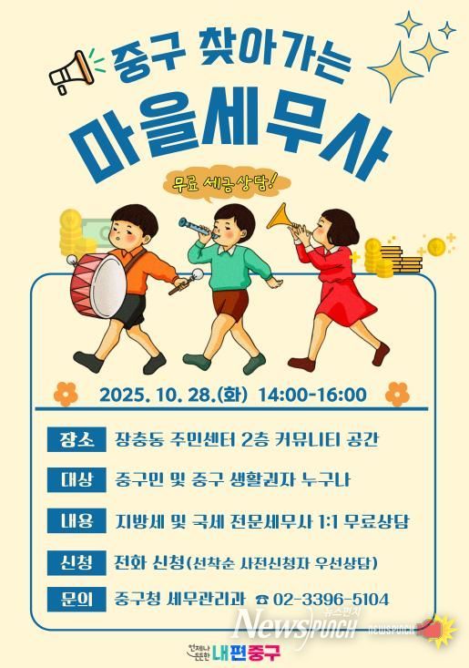 뉴스펀치 김완규 기자 | 서울 중구가 오는 28일 장충동 주민센터에서 오후 2시부터 4시까지 '찾아가는 마을세무사'를 운영한다.
