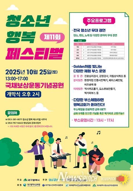 뉴스펀치 조평훈 기자 | 대구광역시는 10월 25일 오후 2시, 국채보상운동기념공원에서 ‘2025년 제11회 청소년 행복 페스티벌’을 개최한다.