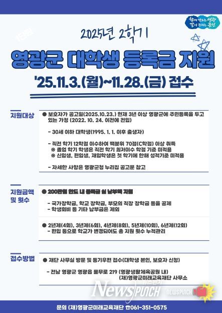 뉴스펀치 김길룡 기자 | (재)영광군미래교육재단(이사장 장세일)이 군민의 교육비 부담을 줄이고 지역의 미래 인재를 육성하기 위한 2025년 2학기 대학생 등록금 지원사업을 시행한다.