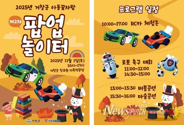 뉴스펀치 김길룡 기자 | 거창군은 오는 11월 1일, 오전 10시부터 오후 5시까지 남상면 창포원에서 ‘아동꿈자람 팝업놀이터’ 행사를 운영할 예정이다. 이번 행사는 지난 7월 수승대 잔디광장에서 열린 행사에 이어 두 번째로 마련된 것으로, 거창군 국화축제 기간 중 열리며 아이들이 자유롭고 안전하게 즐길 수 있는 체험형 놀이공간을 제공한다.