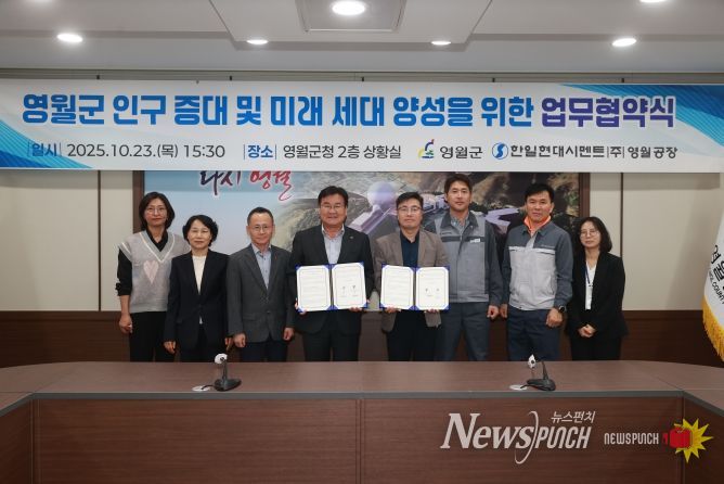 뉴스펀치 김길룡 기자 | 영월군은 23일 한일현대시멘트(주) 영월공장(공장장 허권회)과 인구 증대 및 미래 세대 양성을 위한 업무 협약을 체결했다고 밝혔다.