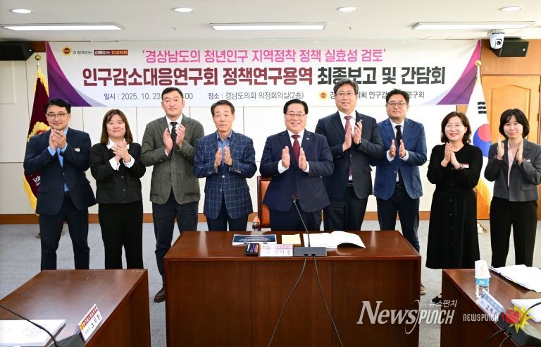 뉴스펀치 김길룡 기자 | 경남도의회 의원 연구단체 인구감소대응연구회(회장 전기풍 의원)는 23일 ‘경상남도의 청년인구 지역정착 정책 실효성 검토’를 주제로 한 정책연구용역의 최종 보고회를 개최했다.