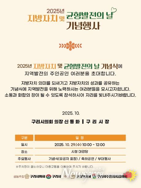 뉴스펀치 김길룡 기자 | 구리시의회는 오는 10월 29일에 구리시청 1층 대강당에서 ‘2025년 지방자치 및 균형발전의 날 기념식’을 개최한다.